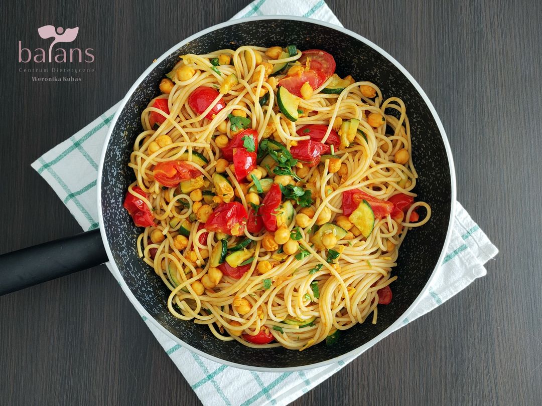 MAKARON Z CIECIERZYCĄ, CUKINIĄ I POMIDORKAMI