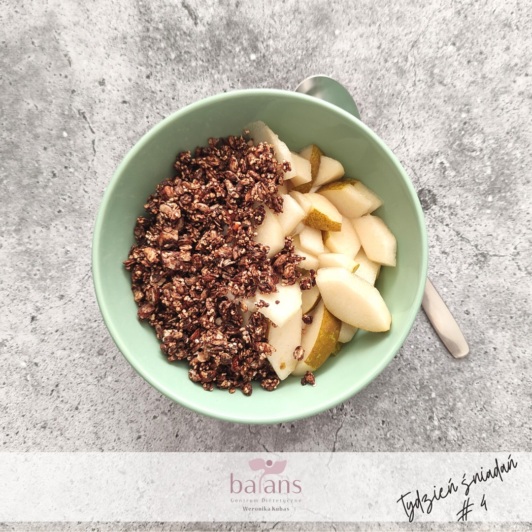 Dziś kolejna pyszna propozycja śniadaniowa: jogurt z pyszną czekoladową granolą i gruszką:)