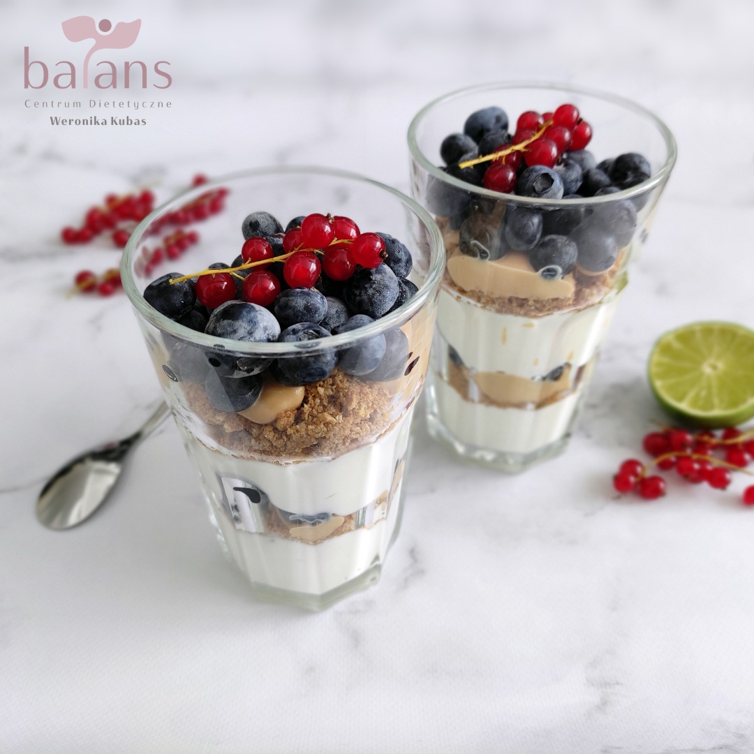 4. W wysokiej szklance/słoiczku układać warstwami masę serkową, ciasteczka, masło orzechowe i owoce. Warto schłodzić przed podaniem.