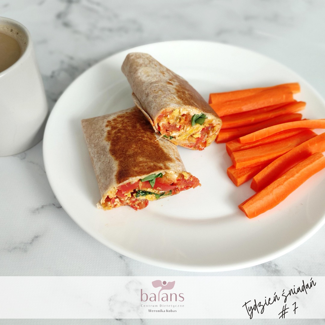Na oleju podsmażamy cebulkę, następnie dorzucamy pomidory i przyprawy (sól, pieprz, słodka papryka, ulubione zioła). Mieszamy, a kiedy pomidory odparują dodajemy jajka i smażymy do ścięcia. Doprawiamy do smaku. Gotową jajecznicę przekładamy na placek tortilli, dodajemy ser żółty i świeże zioła. Tortillę zawijamy i opiekamy na suchej patelni z obu stron. Można gotową tortillę przekroić na pół. Marchewki pokrojone w słupki zjadamy jako dodatek.