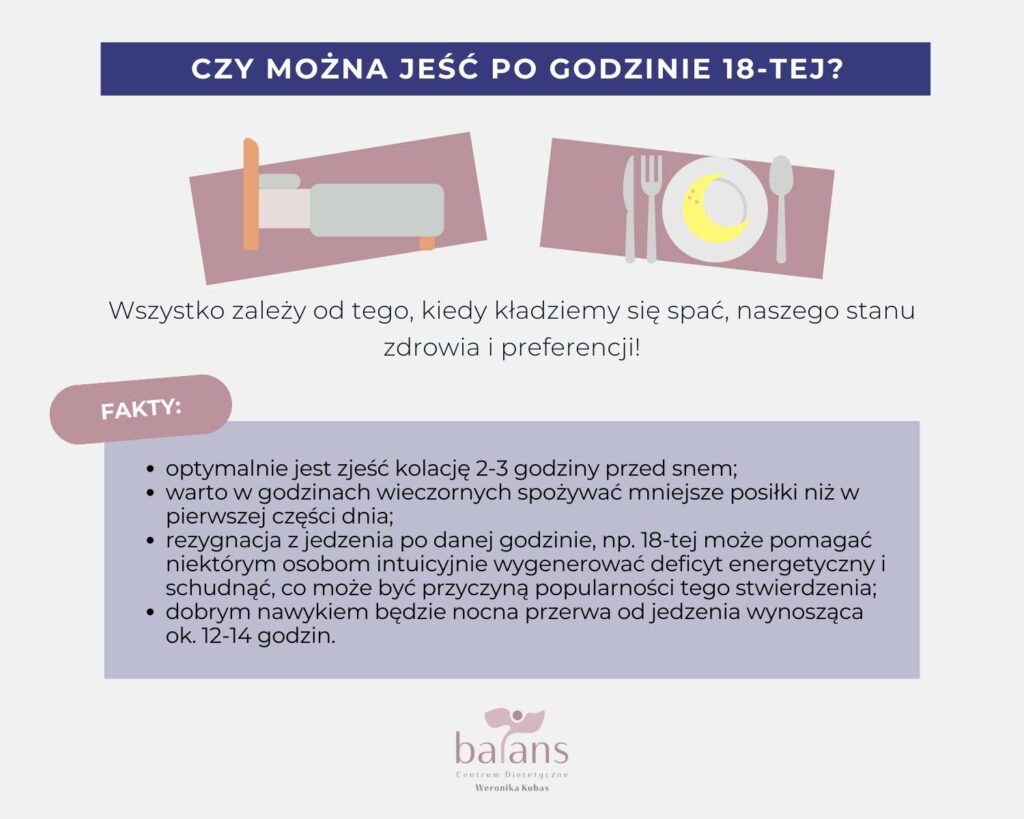 Dla znacznej większości osób odstęp 2-3 godzin między kolacją a zaśnięciem będzie odpowiedni. Więc jeżeli kładziesz się spać o 21, to rzeczywiście jedzenie po 18-tej może już nie być najlepszym pomysłem. Jednak jeśli preferujesz godzinę 23, wtedy kolacja o godzinie 20-tej będzie jak najbardziej w porządku.