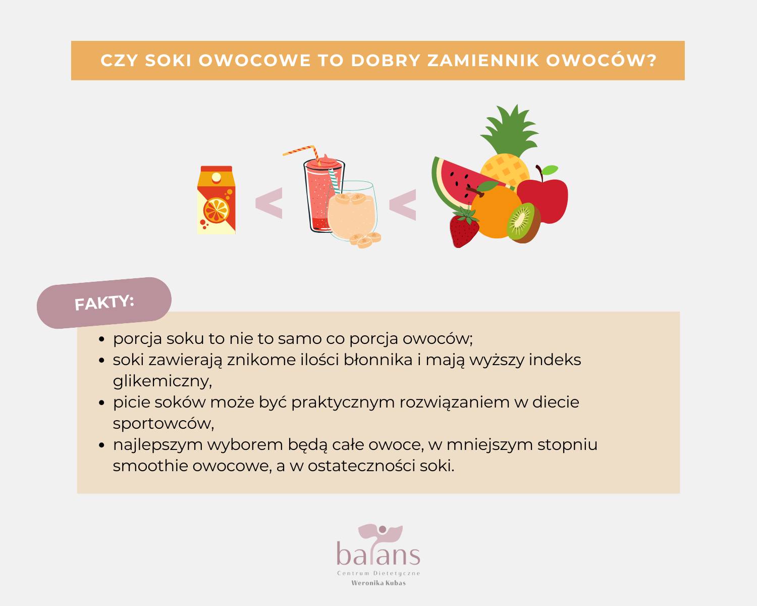 Nie można postawić znaku równości pomiędzy porcją owoców a porcją soku. Trzeba mieć świadomość, że sok zawiera dużo mniej błonnika (a może go wcale nie zawierać) oraz że jest dużo uboższy w witaminy w porównaniu do całych owoców.